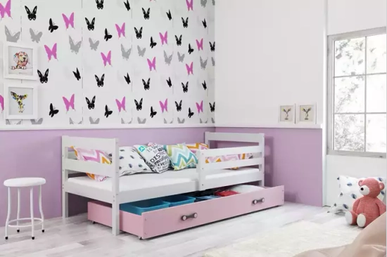 Éric egyszemélyes tiniágy 90x190 matraccal és fiókkal, fehér/rózsaszín