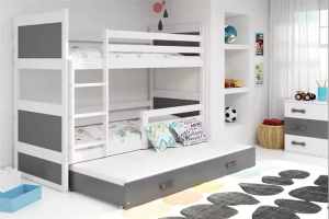 3 SZEMÉLYES TINI EMELETES ÁGY RICO FEHÉR KERET SZÜRKE PANELEK SZÜRKE FIÓK 90 X 190