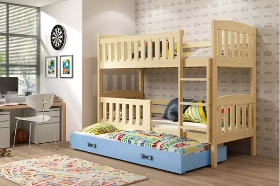 Jacquot 3 üléses tini emeletes ágy 90x190 matraccal és fiókkal, fenyő/kék