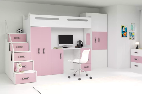 MAX 1 80X200 háromszemélyes ifjúsági ágy íróasztallal, rózsaszínű