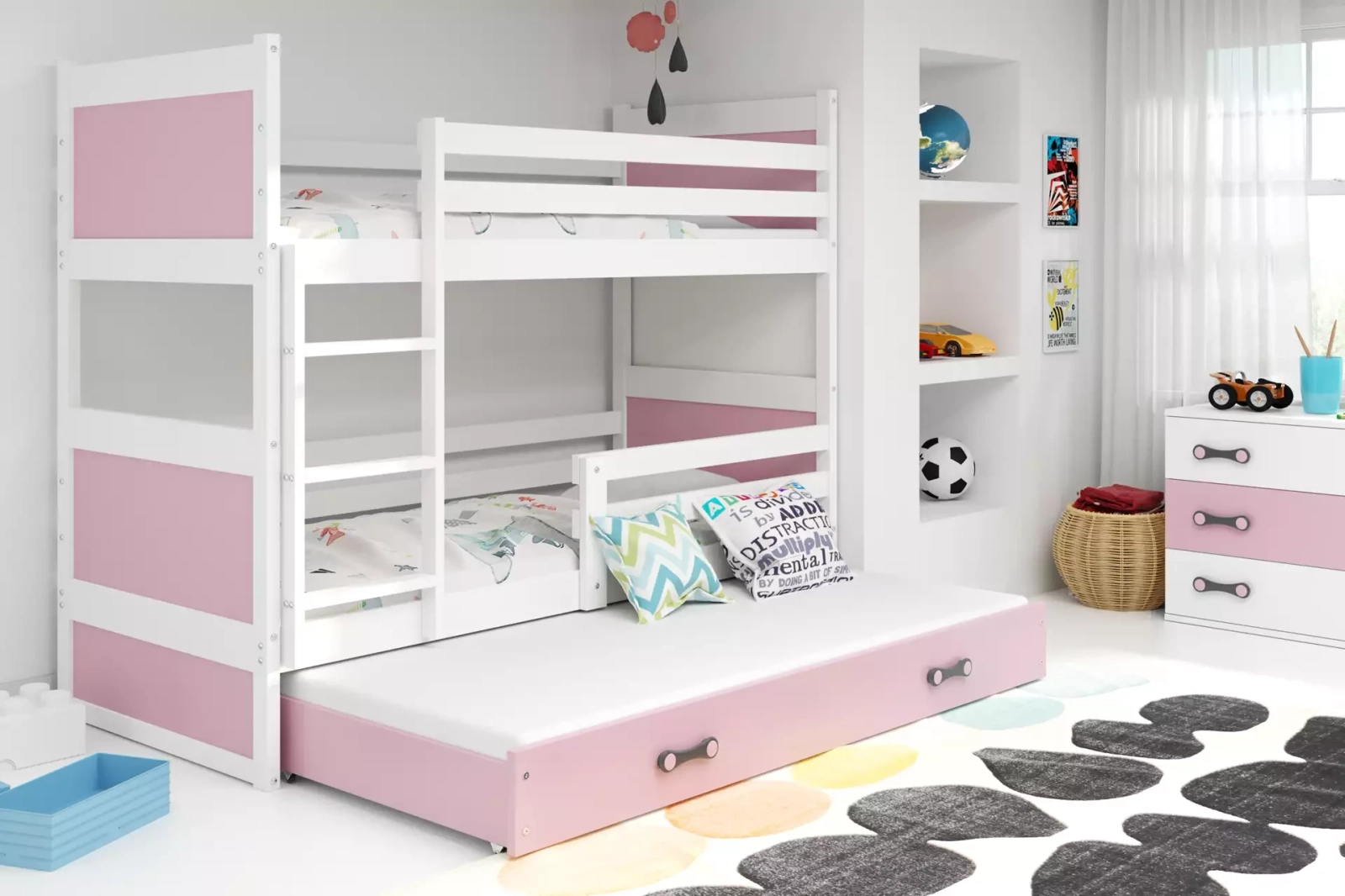 3 ÜLÉSES TINI EMELETES ÁGY RICO FEHÉR KERET RÓZSASZÍN PANELEK RÓZSASZÍN FIÓKOS MATRAC NÉLKÜL 90 X 190