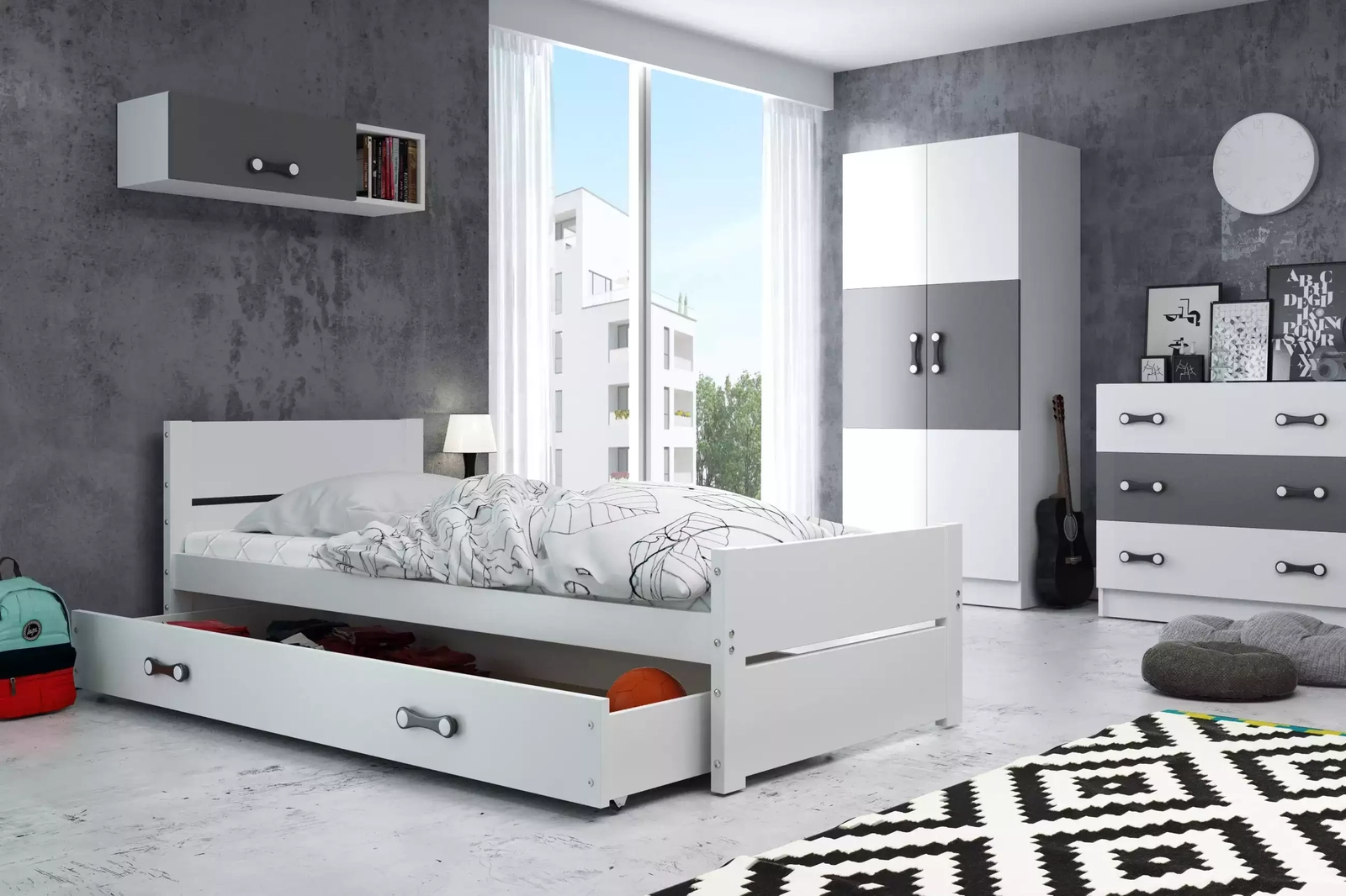 BARTEK 90X200 egyszemélyes ifjúsági ágy matraccal és fiókkal, fehér színben