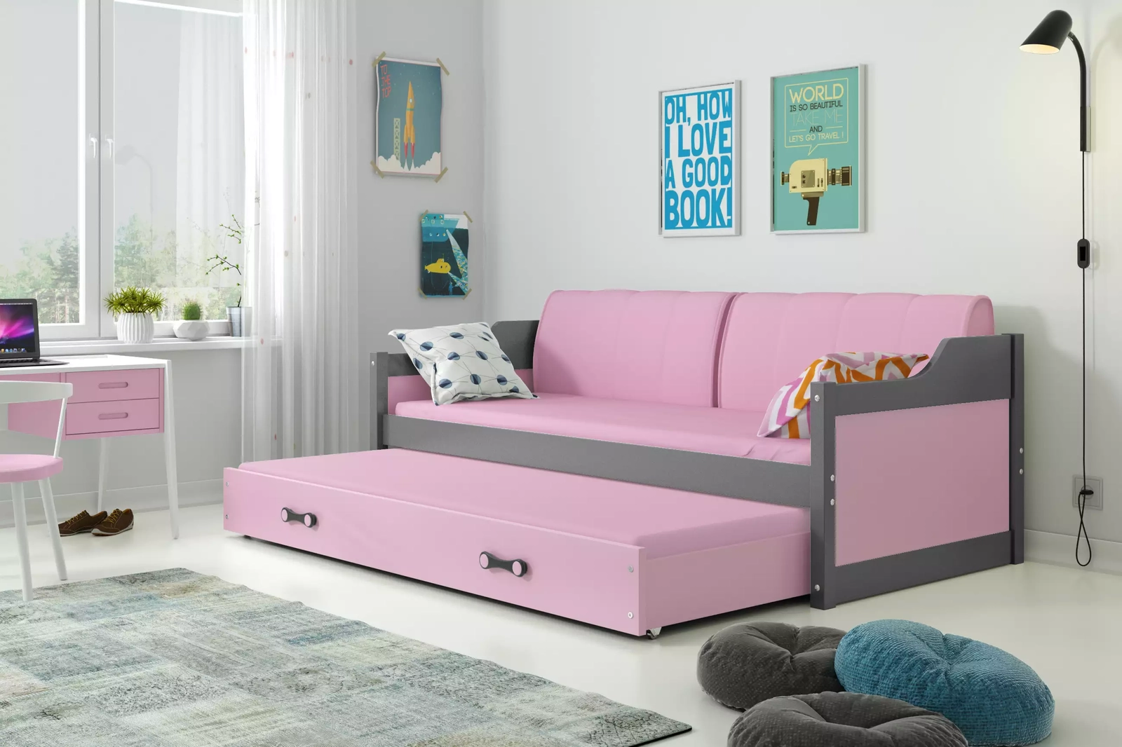 DAWID 90X200 kihúzható ifjúsági ágy matraccal és fiókkal, grafit/rózsaszín