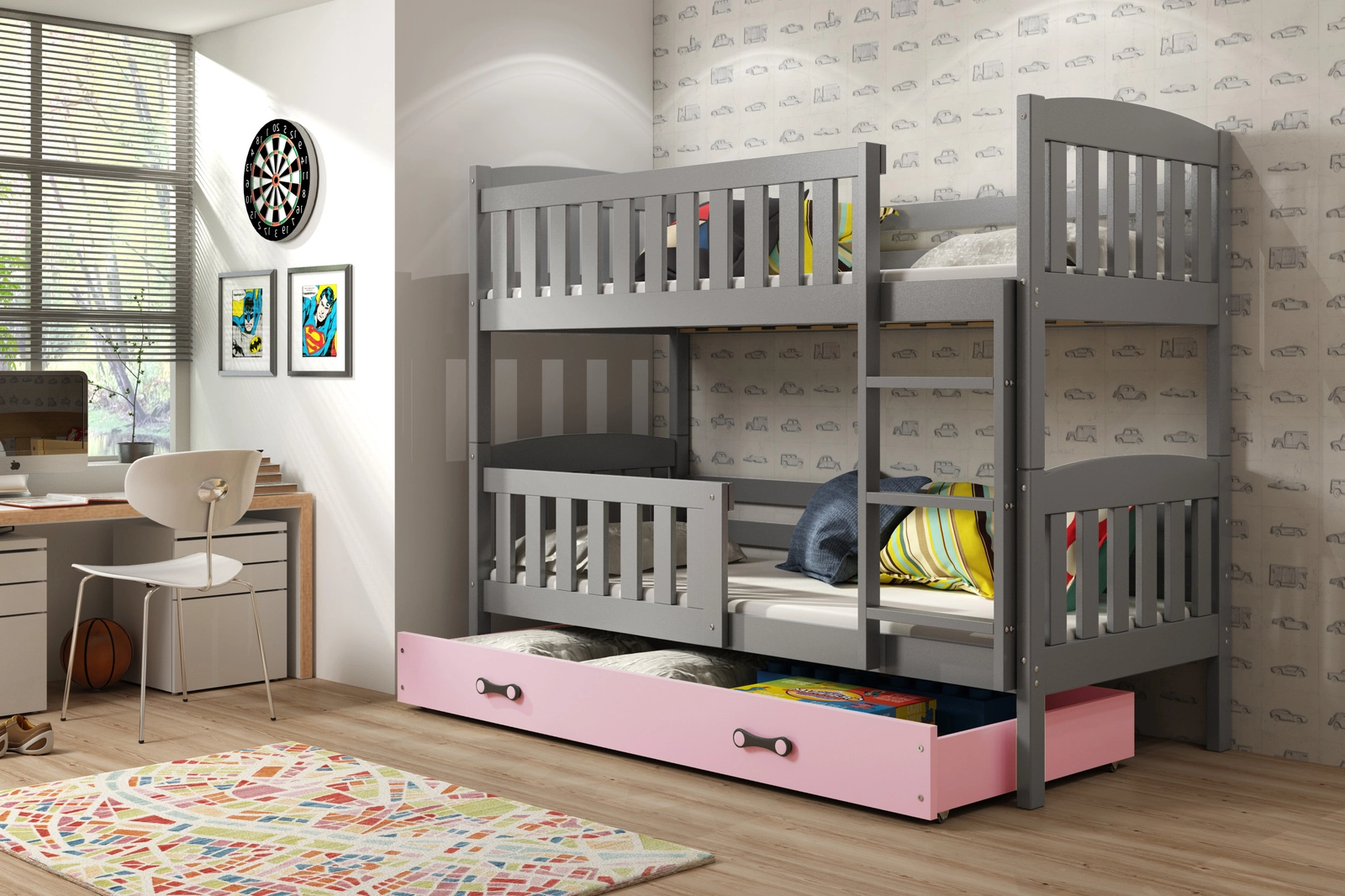 Emeletes ágy KUBUŚ 90X200 fiókkal, grafit/rózsaszín