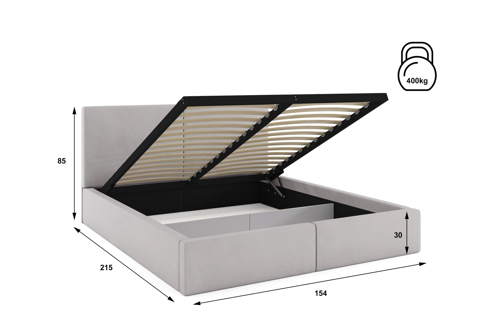 - Felnyitható ágyrács alatti tér elválasztó fallal: hátul nincs alj, elöl ágyneműtartó.