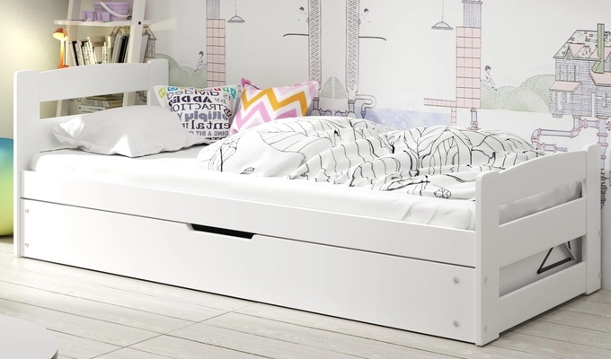 Az Erni egyszemélyes ágyat minden gyermekszobába tervezték. A fenyőfa szerkezet tartós és acélcsavarokkal megerősített, így az ágy akár 100 kg-os terhelésre is alkalmas. A rugós nyírfa deszkakeret kényelmes éjszakai alvást biztosít, és megfelelő alátámasztást nyújt a gerincnek. A rugós emelőkeret alatt ágyneműtartó található, ami megkönnyíti a szoba rendben tartását. A keret fehér színe tökéletesen illik bármilyen elrendezéshez. Összefüggő egészet alkot zöldekkel, rózsaszínnel, szürkével, kékkel, barnával - és még sorolhatnánk. Ezt úgy értük el, hogy a fa felületét teljesen biztonságos és antiallergén festékkel festettük le, így a termék még az érzékeny bőrű gyermekek számára is biztonságos. A semleges színek fiú- és lányszobába egyaránt illenek. Az Erni ágy egy kényelmes megoldás, amely hosszú éveken át kiváló befektetés lesz. Méretének köszönhetően a 90x200 ideális a tinédzserek számára. Másrészt, ha egy kisgyermek számára vásárolt, akkor sok éven át szolgálja őt.