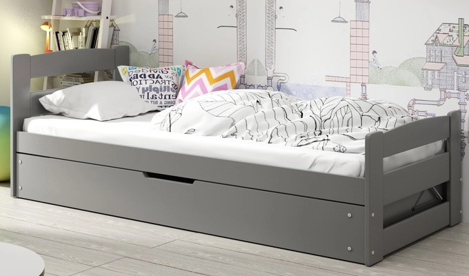 Az Erni egyszemélyes ágyat minden gyermekszobába tervezték. A fenyőfa szerkezet tartós és acélcsavarokkal megerősített, így az ágy akár 100 kg-os terhelésre is alkalmas. A rugós nyírfa deszkakeret kényelmes éjszakai alvást biztosít, és megfelelő alátámasztást nyújt a gerincnek. A rugós emelőkeret alatt ágyneműtartó található, ami megkönnyíti a szoba rendben tartását. A grafit színt a fa felületének teljesen biztonságos és antiallergén festékkel történő festésével nyerték el, ami a terméket még az érzékeny bőrű gyermekek számára is biztonságossá teszi. Az Erni ágy egy kényelmes megoldás, amely hosszú éveken át kiváló befektetés lesz. Méretének köszönhetően a 90x200 ideális a tinédzserek számára. Másrészt, ha egy kisgyermek számára vásárolt, akkor sok éven át szolgálja őt.