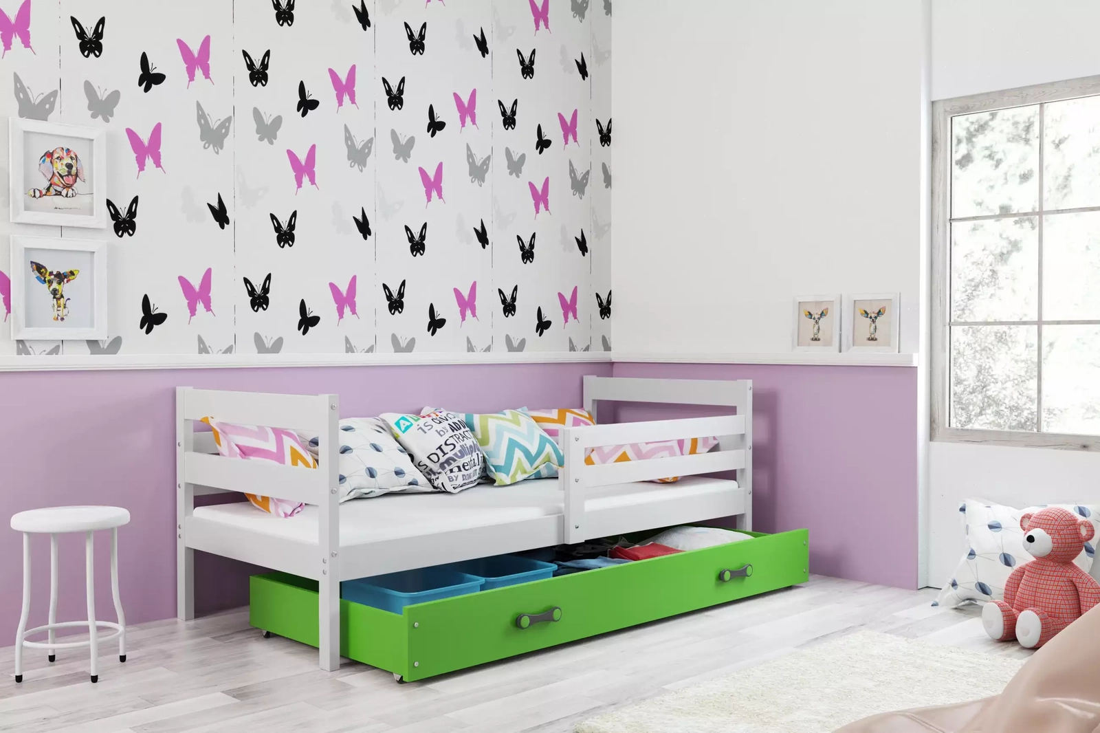 Ifjúsági egyszemélyes ágy ERYK 90X200 fiókkal, fehér/zöld