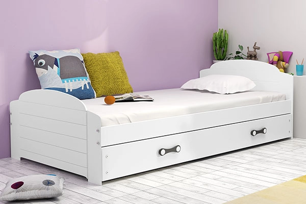 A kínált változatot matrac nélkül kínáljuk. A keret alatti extra fiók használható tárolásra, pl. játékok számára, de extra alvóhelyként is - egyszerűen adjon hozzá egy matracot. Akkor a Lili franciaágy kényelmes modell lesz két gyerek számára, akik egy szobán osztoznak, vagy alkalmi alvóhely a gyermekvendégek számára.