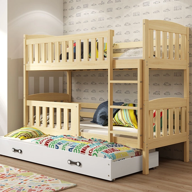 Két pihenőhelyen lehetőség van korlátok felszerelésére, amelyek megvédik a kis utasokat az esésektől, így biztosítva a kényelmüket és az Ön nyugodt alvását. A harmadik ágyat ügyesen elrejtették egy fiókban a tartós forgácslap ágy alatt. Használható napi pihenőhelyként a következő nagyobb gyermek számára, vagy alkalmanként - gyermekei barátai számára, akik úgy döntenek, hogy éjszakáznak itt.