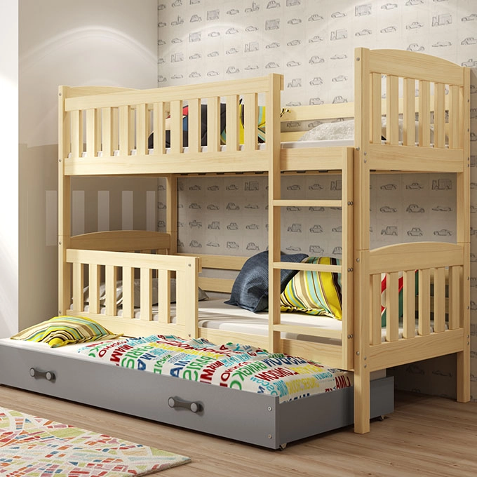 Jacquot 3 üléses tini emeletes ágy 90x190 matraccal és fiókkal, fenyőszürke/szürke