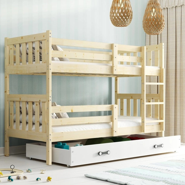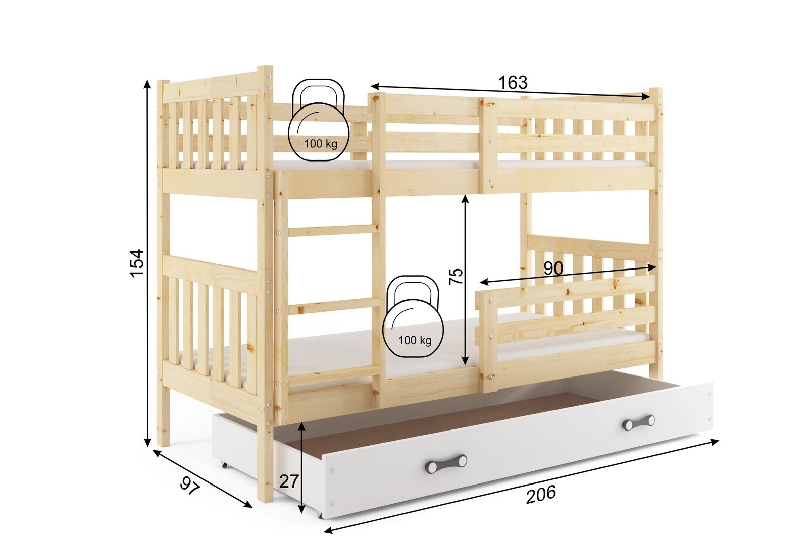 Junior emeletes ágy KACPER 90X200 matraccal és fiókkal, borovi fenyőfa/fehér