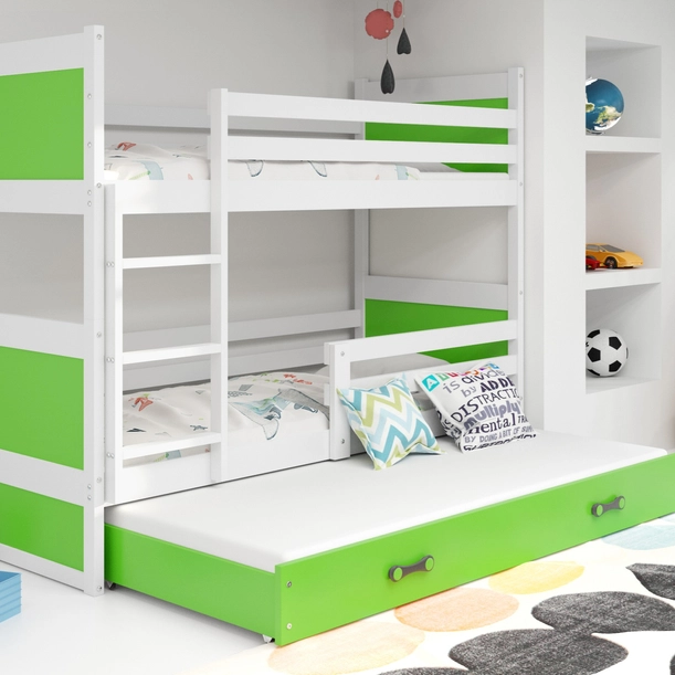 Junior háromszemélyes ágy RICO 90X200 matraccal és fiókkal, fehér/zöld