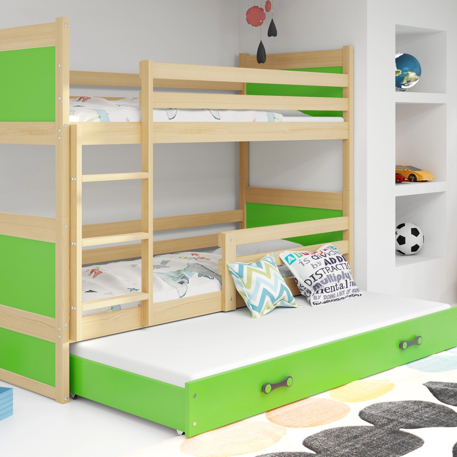 Junior háromszemélyes ágy RICO 90X200 matraccal és fiókkal, fenyő/zöld