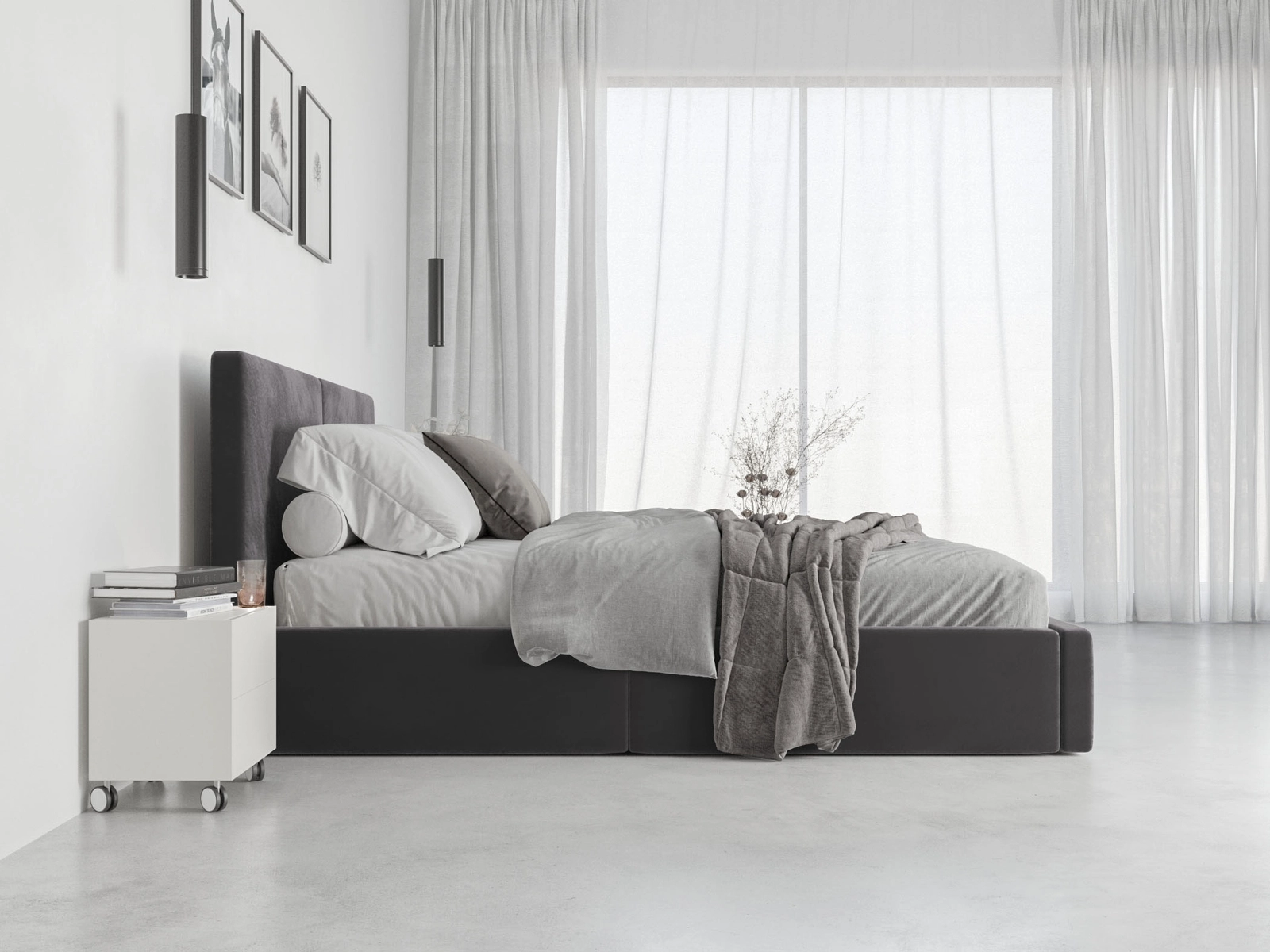 A modell egyik fő előnye a magas fejtámla, amely nemcsak eleganciát kölcsönöz, hanem gyakorlati funkcióval is rendelkezik. Lehetővé teszi, hogy kényelmesen hátradőlhessen, miközben könyvet olvas vagy tévét néz a hálószobában. A grafit színű kárpitozás modern és stílusos hatást kölcsönöz a belső térnek, ugyanakkor könnyen tisztítható.