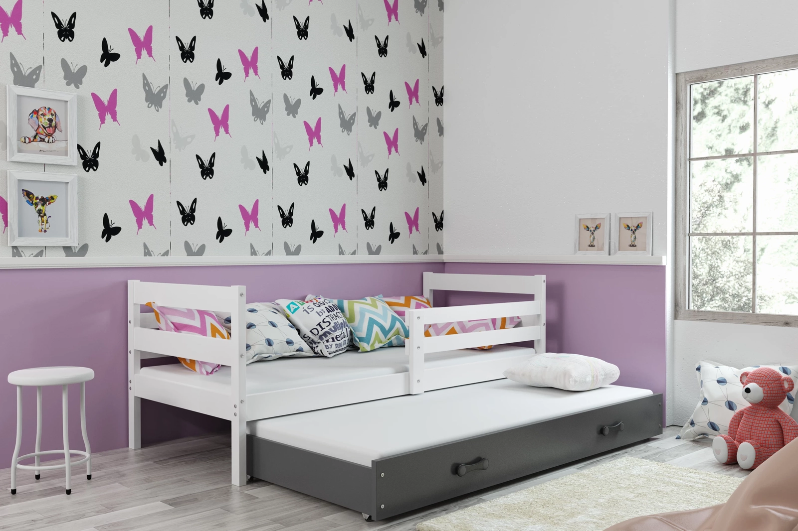 Az Erik ifjúsági ágyat univerzális jellege jellemzi, így fiú- és lányszobában egyaránt elhelyezhető. A nagy hasznos terület azt jelenti, hogy a bútorok minden korosztály számára alkalmasak, ezért több évre kiváló befektetésnek bizonyulnak. A fiókos ifjúsági ágy is nagyon funkcionális bútordarab. Ez annak köszönhető, hogy széles körű felhasználási lehetőségei vannak mind ifjúsági kétszemélyes ágyként, mind pedig mindenféle dolog, ruhák és ágynemű tárolására szolgáló tárolóhelyként. Az egyes szintek terhelhetősége akár 100 kg is lehet, ami erőt és tartósságot jelent. Az ifjúsági ágy más színváltozatokban is kapható. Fehér és grafit keretárnyalat és természetes fenyő színben kapható. Ezenkívül a fiók színe is illeszthető a következőkhöz. A sorompó jobbra vagy balra szerelhető, a választás az összeszerelés során történik.