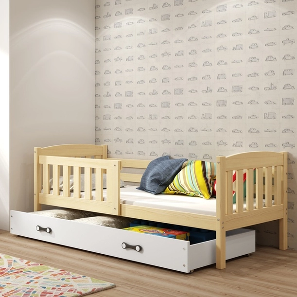 KUBUŚ 80X160 egyszemélyes ágy fiókkal, fenyőfa/fehér