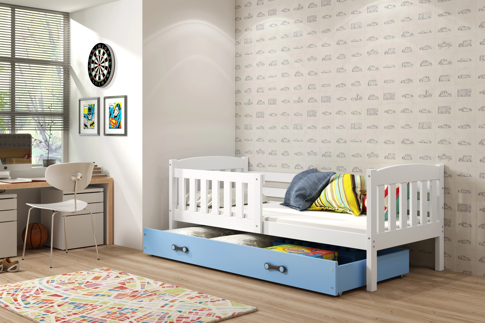 KUBUŚ 80X160 egyszemélyes ágy matraccal és fiókkal, fehér/kék