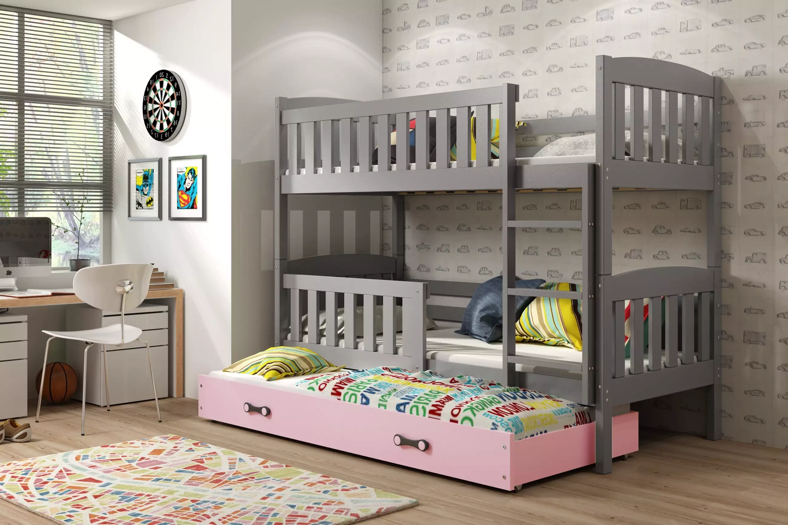 KUBUŚ 90X190 ágy fiókkal, grafit/rózsaszín, háromszemélyes ágy