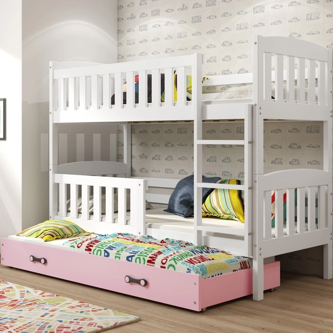 KUBUŚ 90X190 háromszemélyes ifjúsági ágy fiókkal, fehér/rózsaszín