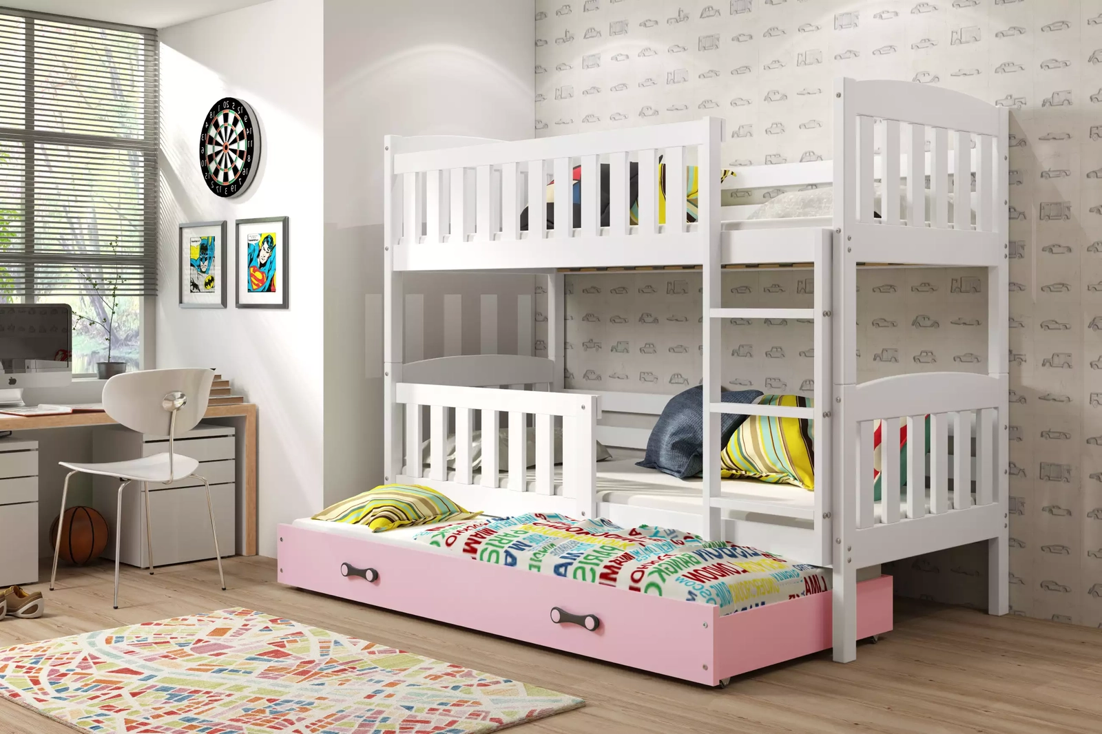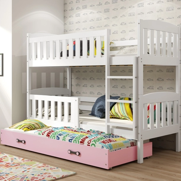 KUBUŚ 90X190 háromszemélyes ifjúsági ágy matraccal és fiókkal, fehér/rózsaszín