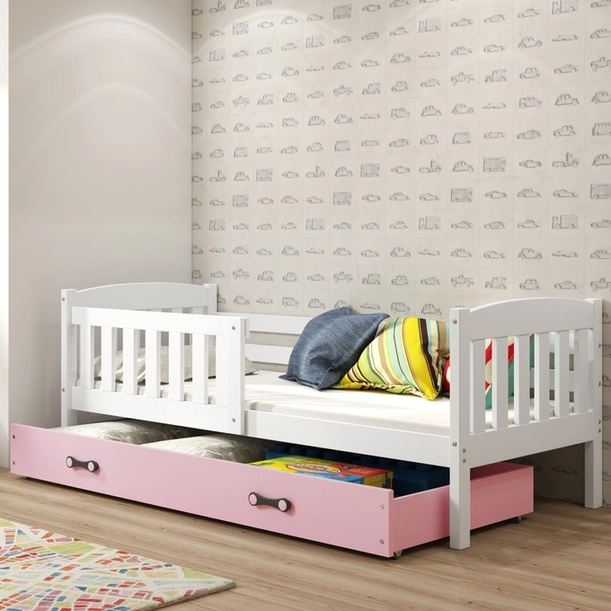 KUBUŚ 90X200 egyszemélyes ifjúsági ágy fiókkal, fehér/rózsaszín