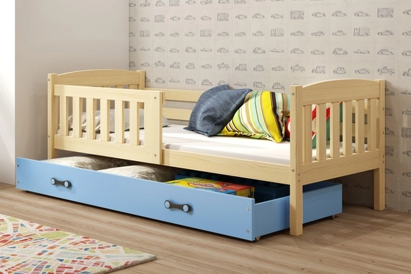 KUBUŚ 90X200 egyszemélyes ifjúsági ágy fiókkal, fenyő/kék
