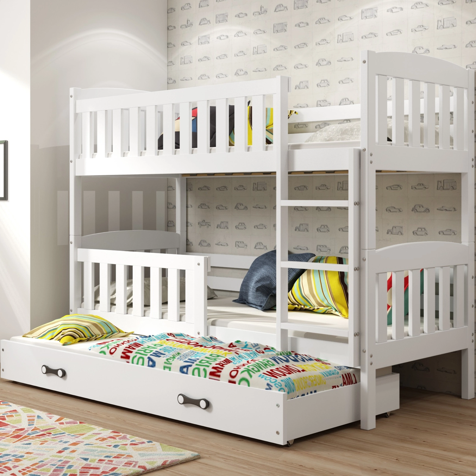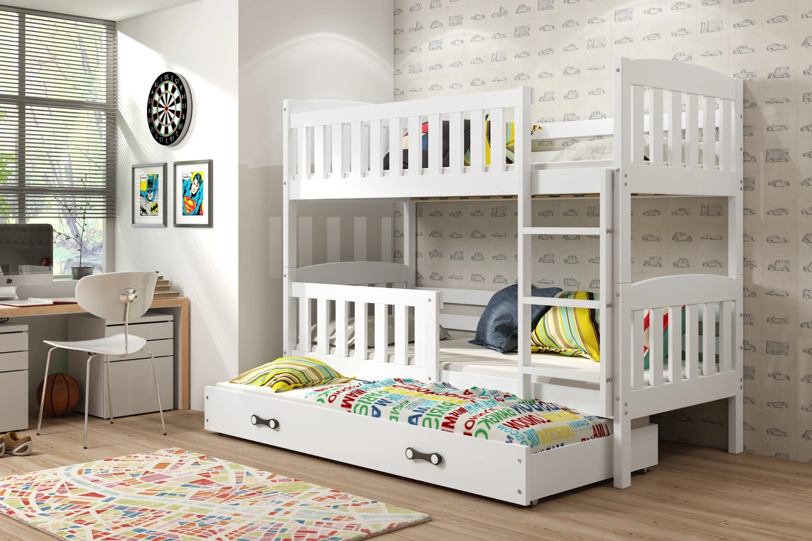 KUBUŚ 90X200 háromágyas ifjúsági ágy matraccal és fiókkal, fehér színben