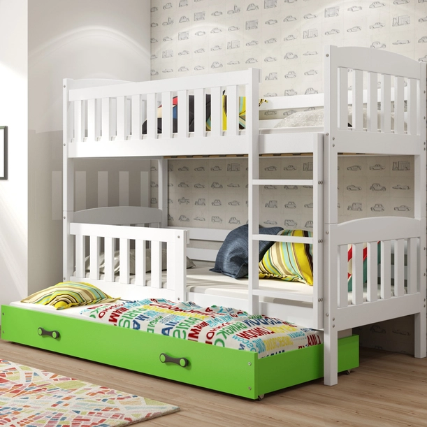 KUBUŚ 90X200 háromszemélyes ifjúsági ágy fiókkal, fehér/zöld