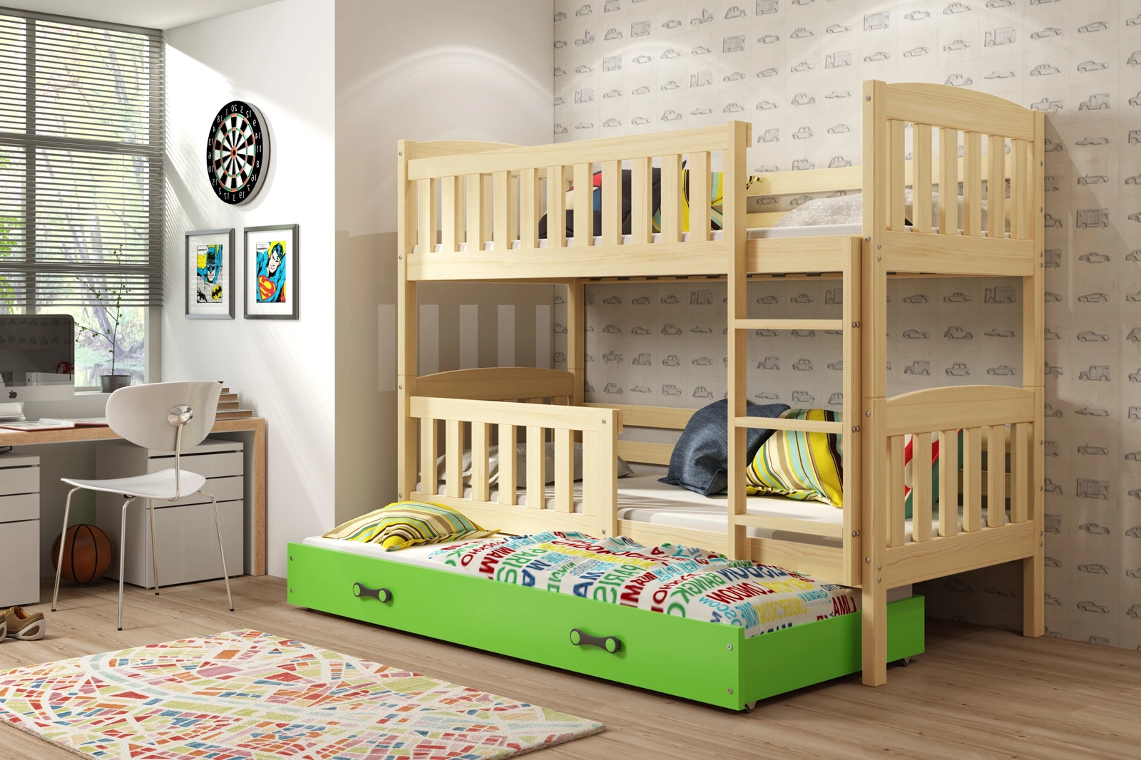 KUBUŚ 90X200 háromszemélyes ifjúsági ágy matraccal és fiókkal, fenyő/zöld