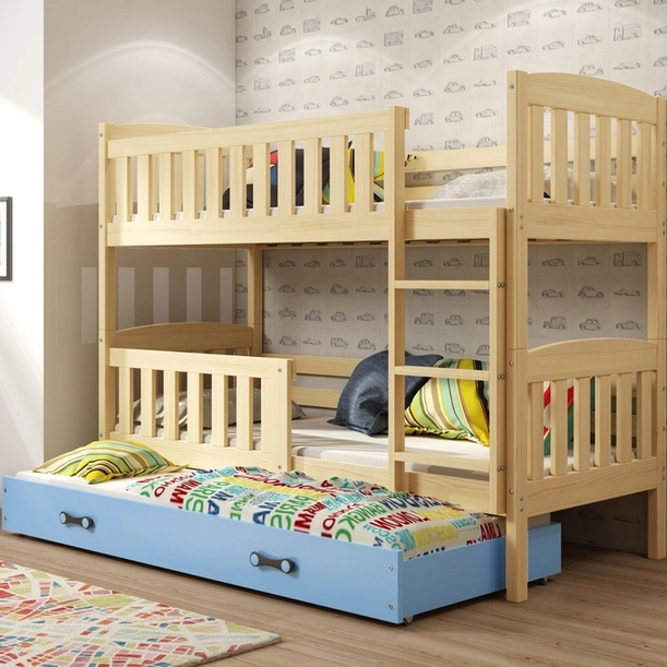 KUBUŚ 90X200 ifjúsági háromszemélyes ágy fiókkal, fenyőfa/kék