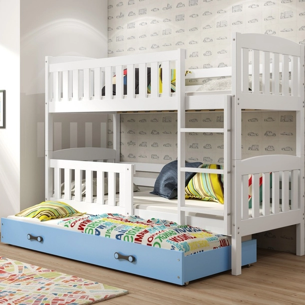 KUBUŚ 90X200 ifjúsági háromszemélyes ágy matraccal és fiókkal, fehér/kék