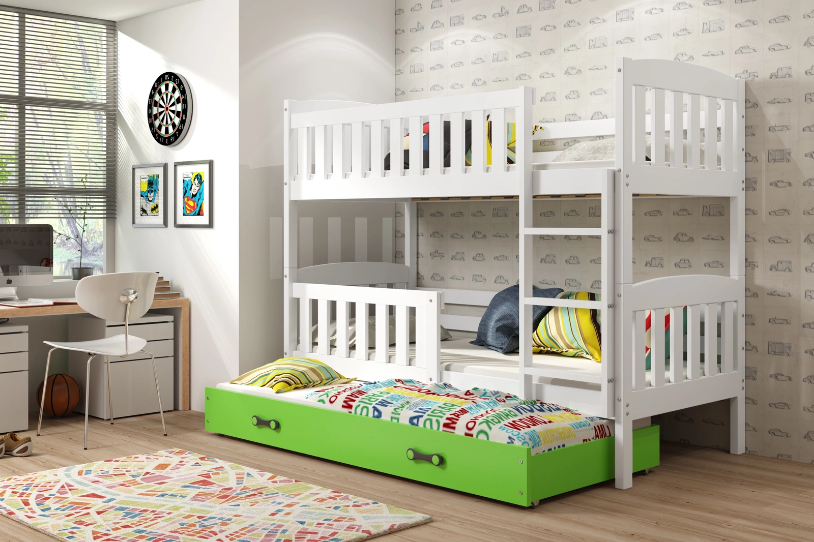 KUBUŚ 90X200 ifjúsági háromszemélyes ágy matraccal és fiókkal, fehér/zöld