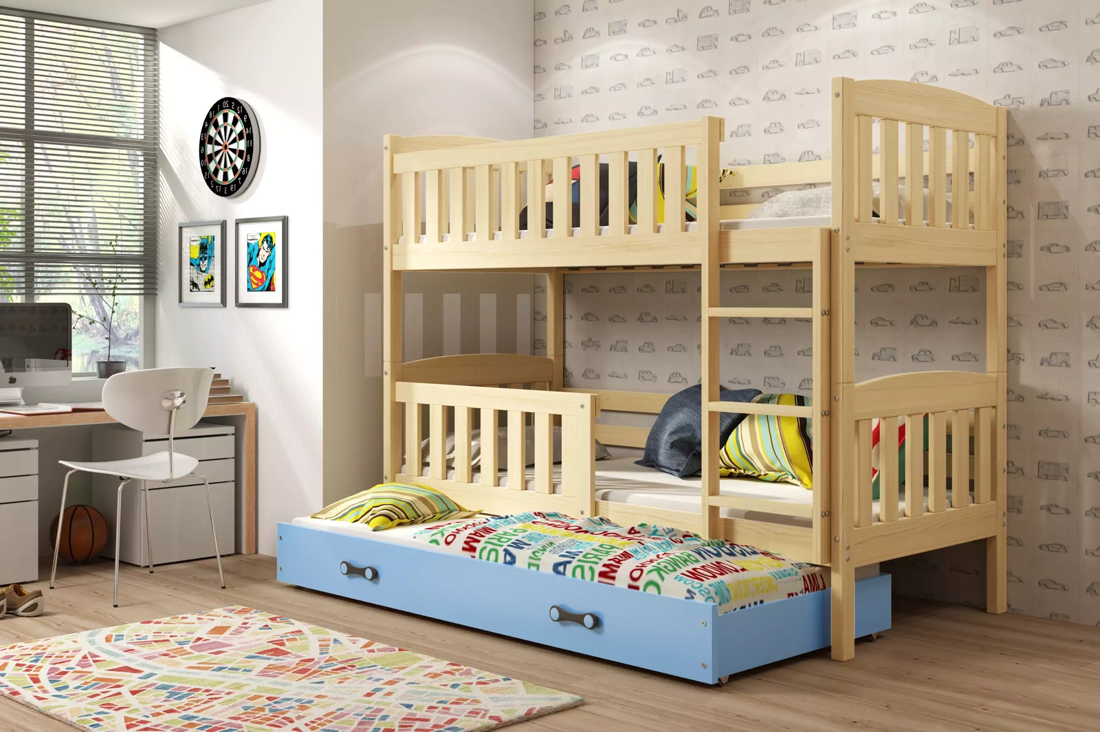 KUBUŚ 90X200 ifjúsági háromszemélyes ágy matraccal és fiókkal, fenyő/kék