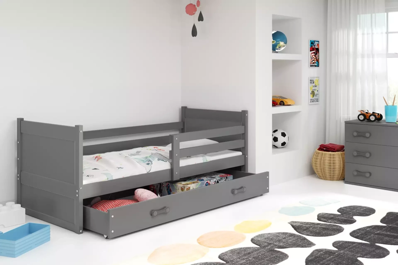 A RICO gyermekágy rendkívül funkcionális megoldás fiú- és lányszobákba egyaránt. Minimalista kialakításának köszönhetően tökéletesen illeszkedik bármilyen dekorációhoz. Az univerzális színeknek köszönhetően könnyen kombinálható a legkülönfélébb összeállításokkal. A grafitra festett ágy intenzív, mégis semleges megoldás, a végső elrendezés pedig a többi elemtől - a falak és a kiegészítők színétől - függ. A szerkezet fedésére használt festék antiallergén és rendelkezik az összes szükséges jóváhagyással.
