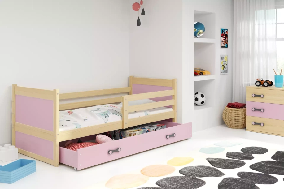 Rico egyszemélyes tiniágy 90x190 matraccal és fiókkal, fenyő/rózsaszín