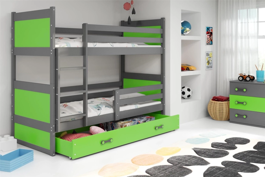 Rico emeletes ágy 90x190 matraccal és fiókkal, szürke/zöld