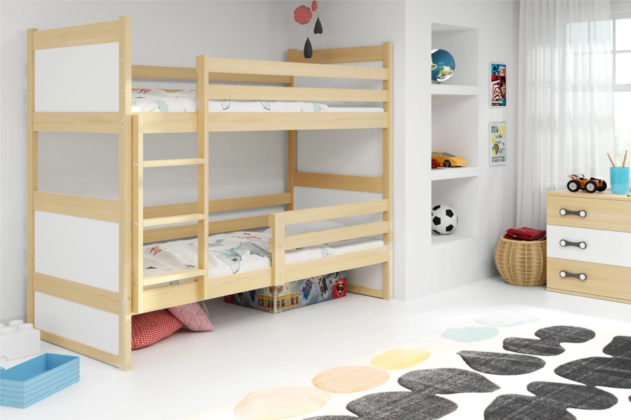 Tudjuk, hogy az Ön célja a gyermekek biztonságának és kényelmének biztosítása. Azt akarod, hogy legyen saját sarkuk a házban. Azzal is tökéletesen tisztában vagyunk, hogy két gyermek számára közös hálószobát kialakítani, különösen, ha nagy a korkülönbség, nem kis feladat. Ha ez kihívást jelent az Ön számára, akkor a RICO emeletes ágyat csak az Ön számára készítettük el. A 90x190-es méretnek köszönhetően hosszú évekre szóló befektetés. Tökéletesen alkalmas egy 3 éves gyermek és egy tinédzser hálószobájába. A fa szerkezet stabil, a nagy szilárdságú csavarok pedig extra szilárdságot biztosítanak. A felső és alsó ágyakra szerelt korlátok a kicsiket az esésektől is megvédik, még akkor is, ha éjszaka még tele vannak kolibri-szerű energiával. A természetes fa színét csak szagtalan lakkal emeltük ki. Ezáltal a keret szennyeződésálló, tartós és biztonságos. A természetes fa bármilyen helyiséget felmelegít, és számos tervezési lehetőséget kínál. Az alsó fehér fiók ágyként vagy extra tárolóhelyként használható a játékok számára. Praktikus megoldás, amelyet mindenekelőtt akkor fogsz szeretni, ha szeretsz rendet tartani.