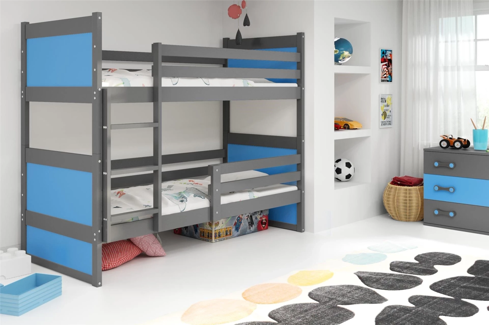 Tudjuk, hogy az Ön célja a gyermekek biztonságának és kényelmének biztosítása. Azt akarod, hogy legyen saját sarkuk a házban. Azzal is tökéletesen tisztában vagyunk, hogy két gyermek számára közös hálószobát kialakítani, különösen, ha nagy a korkülönbség, nem kis feladat. Ha ez kihívást jelent az Ön számára, akkor a RICO emeletes ágyat csak az Ön számára készítettük el. A 90x190-es méretnek köszönhetően hosszú évekre szóló befektetés. Tökéletesen alkalmas egy 3 éves gyermek és egy tinédzser hálószobájába. A fa szerkezet stabil, a nagy szilárdságú csavarok pedig extra szilárdságot biztosítanak. A felső és alsó ágyakra szerelt korlátok a kicsiket az esésektől is megvédik, még akkor is, ha éjszaka még tele vannak kolibri-szerű energiával. A szürke egy intenzív, mégis semleges megoldás, és a végső elrendezés a többi elemtől - a falak és a kiegészítők színétől - függ. Az alsó kék fiók minden fiúnak örömet okoz majd. Használható ágyneműtartóként vagy extra tárolóhelyként a játékok számára. Praktikus megoldás, amelyet mindenekelőtt akkor fogsz szeretni, ha szeretsz rendet tartani.