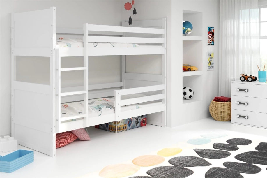 Tudjuk, hogy az Ön célja a gyermekek biztonságának és kényelmének biztosítása. Azt akarod, hogy legyen saját sarkuk a házban. Azzal is tökéletesen tisztában vagyunk, hogy két gyermek számára közös hálószobát kialakítani, különösen, ha nagy a korkülönbség, nem kis feladat. Ha ez kihívást jelent az Ön számára, akkor a RICO emeletes ágyat csak az Ön számára készítettük el. A 90x190-es méretnek köszönhetően hosszú évekre szóló befektetés. Tökéletesen alkalmas egy 3 éves gyermek és egy tinédzser hálószobájába. A fa szerkezet stabil, a nagy szilárdságú csavarok pedig extra szilárdságot biztosítanak. A felső és alsó ágyakra szerelt korlátok a kicsiket az esésektől is megvédik, még akkor is, ha éjszaka még tele vannak kolibri-szerű energiával. A fehér szín univerzális megoldás, amely korlátlan tervezési lehetőséget biztosít Önnek. Az alsó fehér fiók ágyként vagy extra tárolóhelyként használható a játékok számára. Praktikus megoldás, amelyet mindenekelőtt akkor fogsz szeretni, ha szeretsz rendet tartani.